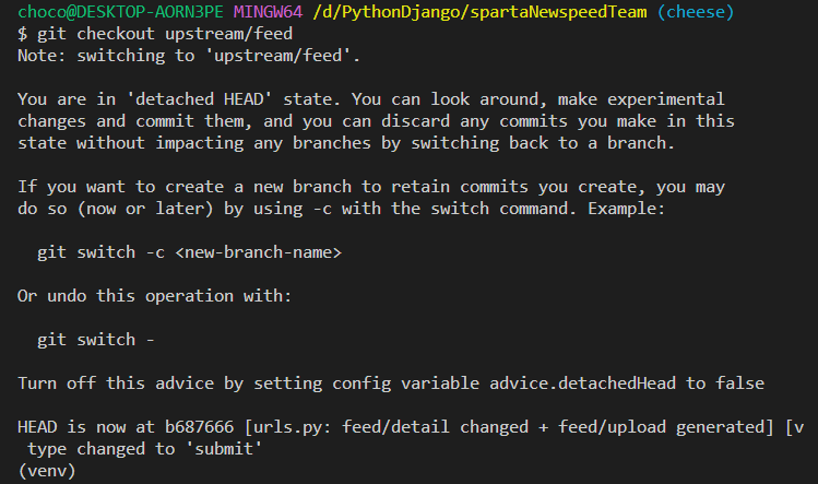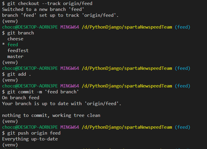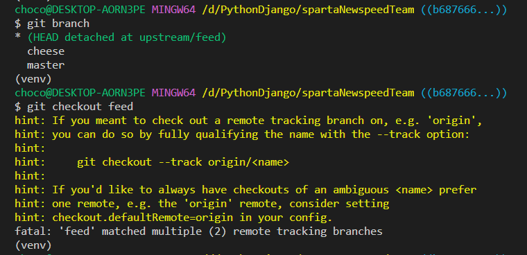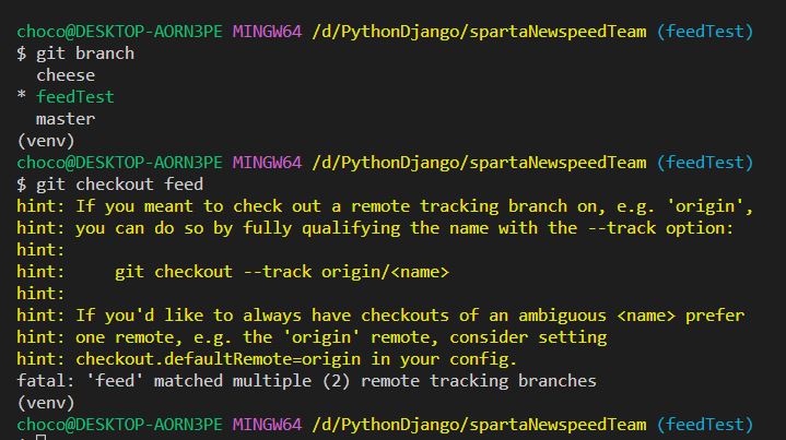 "git checkout feed" 명령어 실행 시 오류 : git checkout --track origin/feed 으로 해결