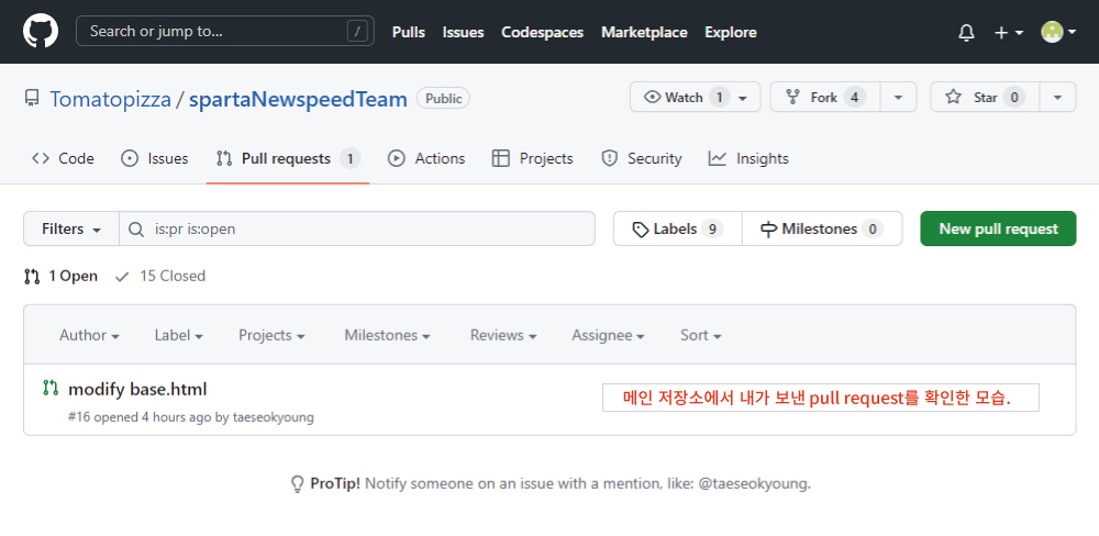 - 풀 리퀘스트를 받은 관리자가 close를 눌렀더니, 나에게 되돌아오지 않았다.